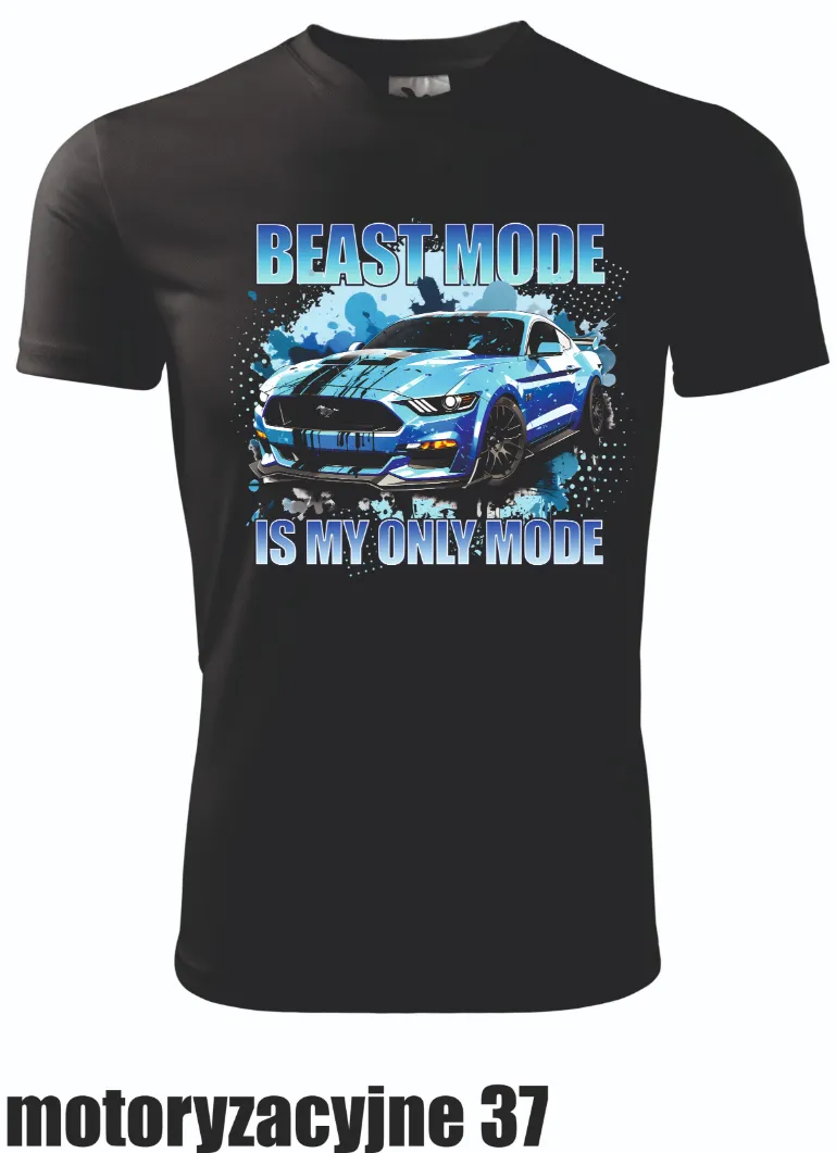 Koszulka z intensywnie niebieską grafiką samochodu i napisem „Beast Mode is my only mode”. To propozycja dla tych, którzy cenią sobie moc i dynamikę w pojazdach.