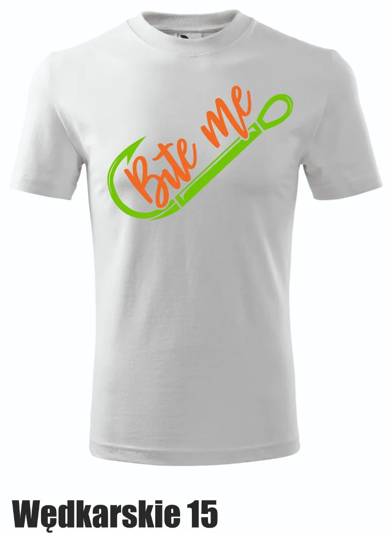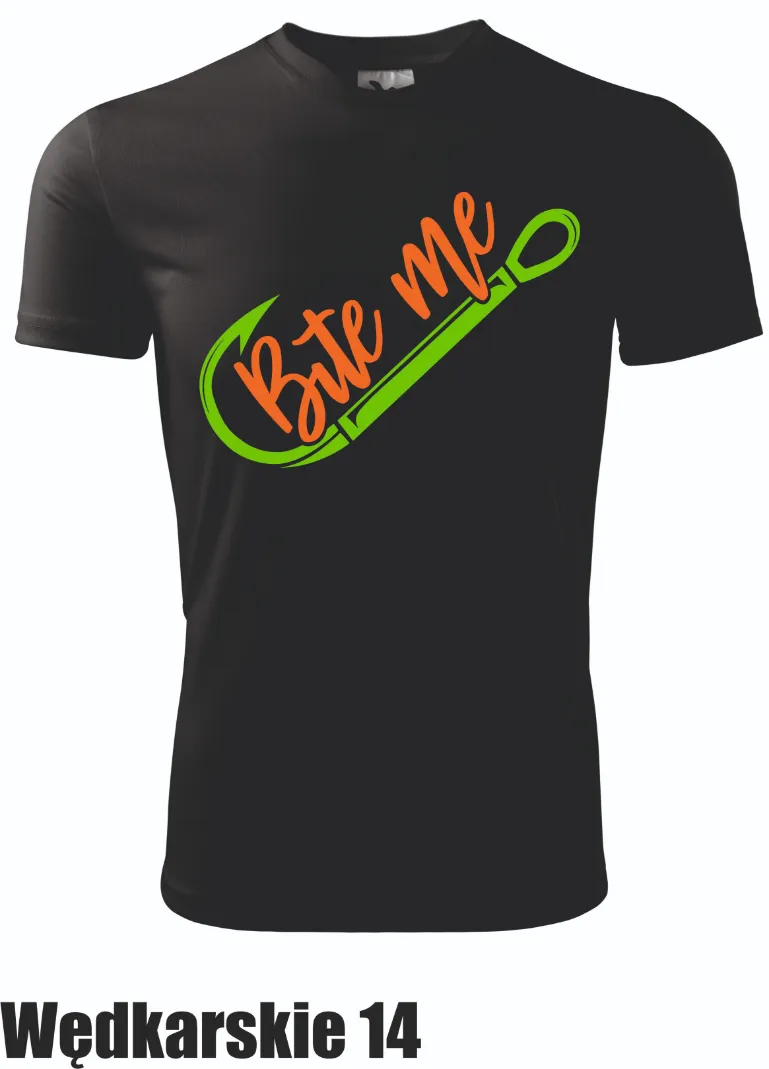 Koszulka z zabawnym napisem „Bite Me” i grafiką haczyka to propozycja dla tych, którzy lubią niebanalne podejście do wędkarstwa. Dynamiczny design w kolorze zielonym i pomarańczowym przyciąga uwagę.