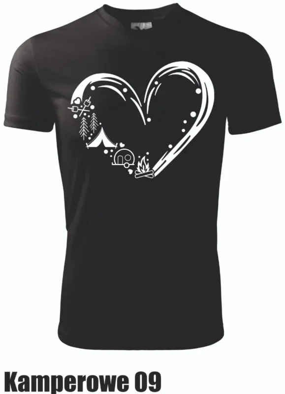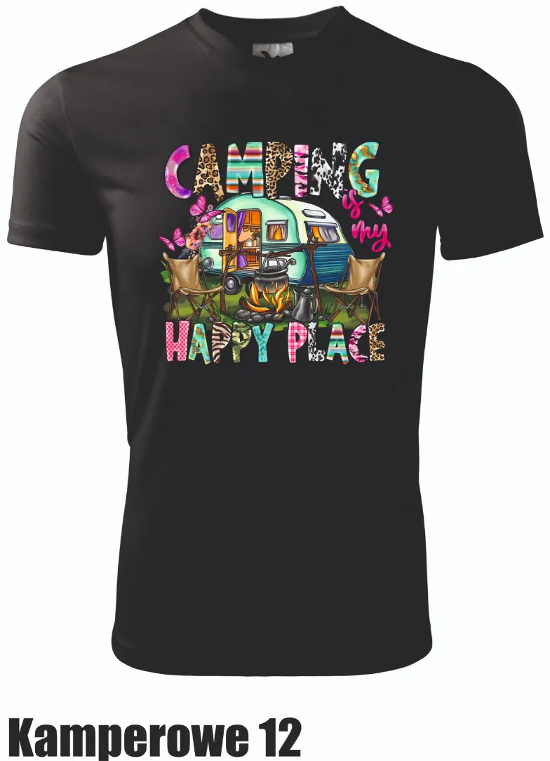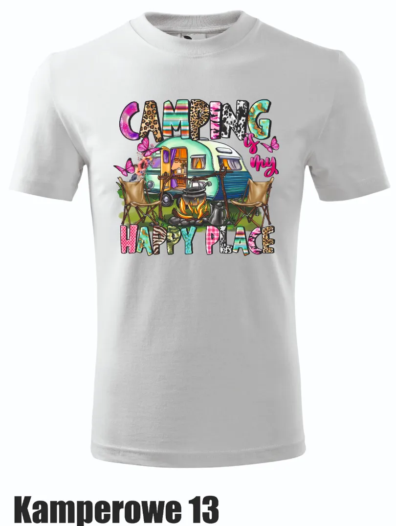 Pełna kolorów i radości koszulka z nadrukiem przedstawiającym kempingowy „Happy Place”. Doskonała na każdą przygodę pod namiotem.