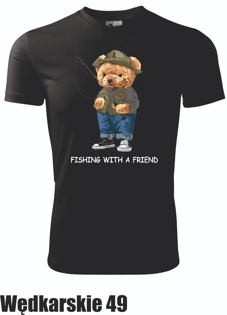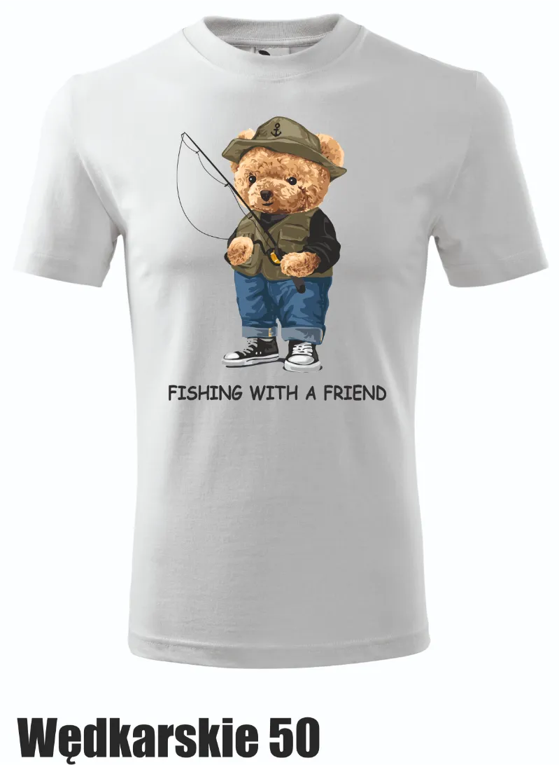 Koszulka z uroczym misiem trzymającym wędkę i napisem „Fishing with a friend”. Koszulka dla osób lubiących humorystyczne motywy i przyjazne wzory.