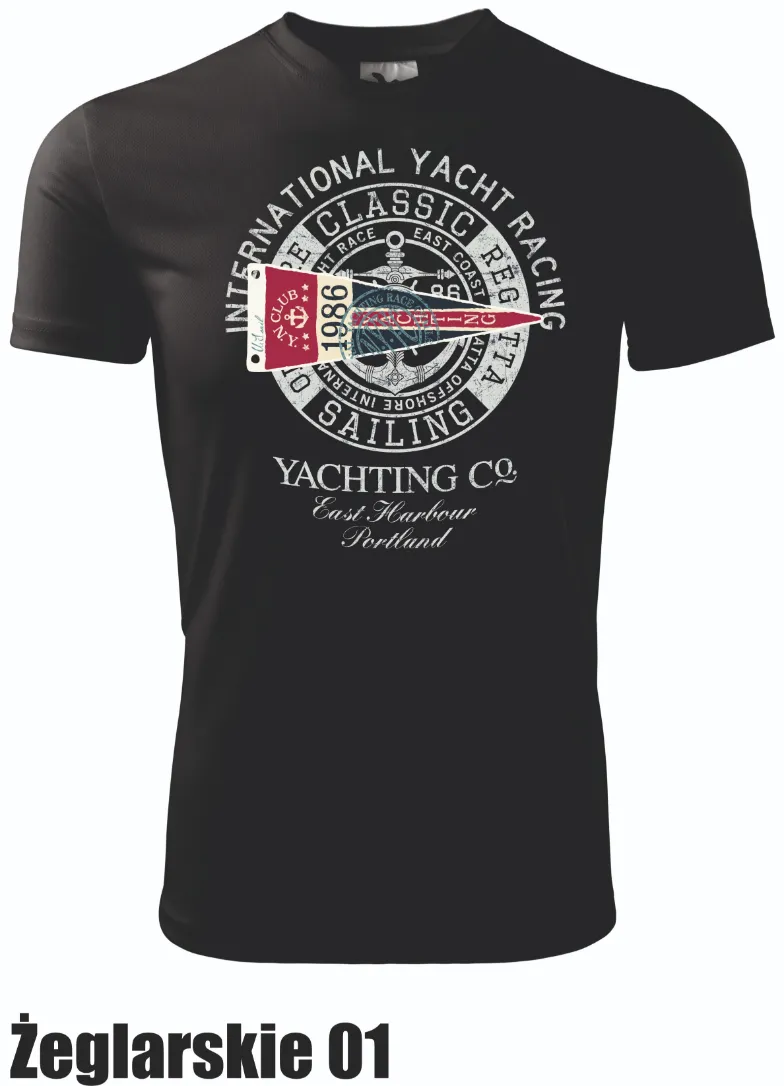 Koszulka z klasycznym motywem „International Yacht Racing”. Idealna dla fanów regat i żeglarstwa. Doskonała do codziennego noszenia, zarówno na lądzie, jak i na wodzie.