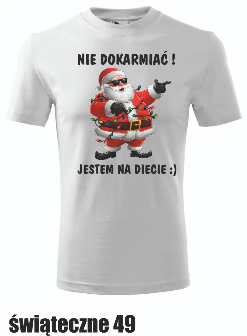 Mikołaj z napisem „Nie dokarmiać! Jestem na diecie :)”. Humorystyczna koszulka dla osób z dystansem do świątecznych kalorii.