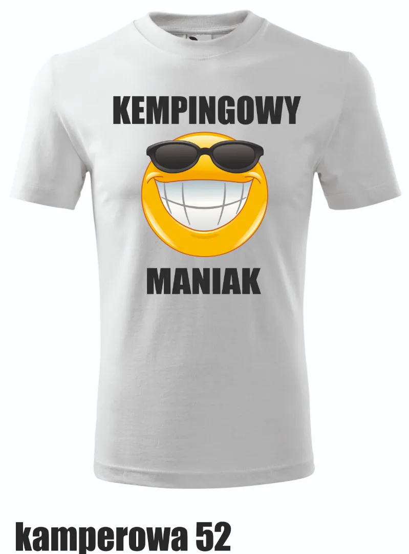 Koszulka dla prawdziwych kempingowych maniaków! Zabawny emotikon w okularach przeciwsłonecznych i napis „Kempingowy Maniak” mówi wszystko o twojej miłości do kempingów.