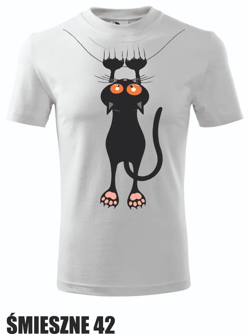 Koszulka z uroczym rysunkiem kota, który zawisa na nitce. Idealna dla miłośników zwierząt i wszystkich, którzy lubią zabawne motywy.