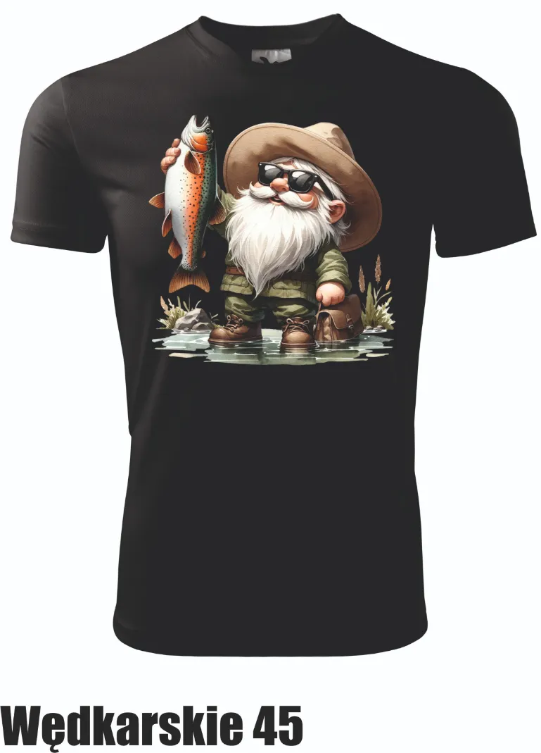 Koszulka na której widnieje krasnal wędkarz z dużą złowioną rybą. Przyjazny design, który wywołuje uśmiech.