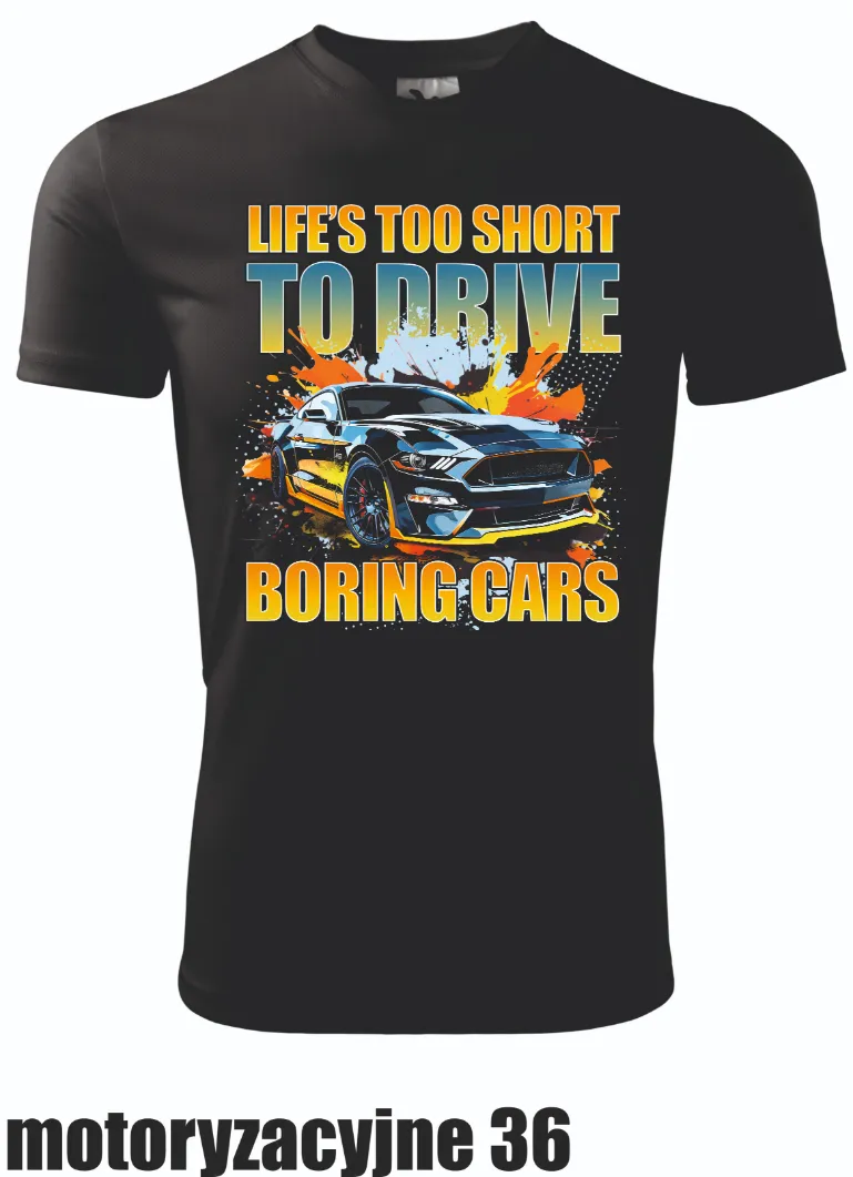 T-shirt z napisem „Life’s too short to drive boring cars” oraz dynamicznym obrazem sportowego samochodu, wyrażającym pasję do szybkiej jazdy.