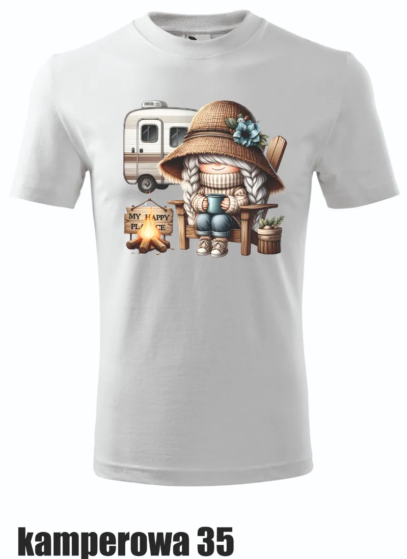 Koszulka z uroczą krasnoludką przy ognisku i napisem 'My Happy Place’ – dla tych, którzy kochają spokój i naturę.