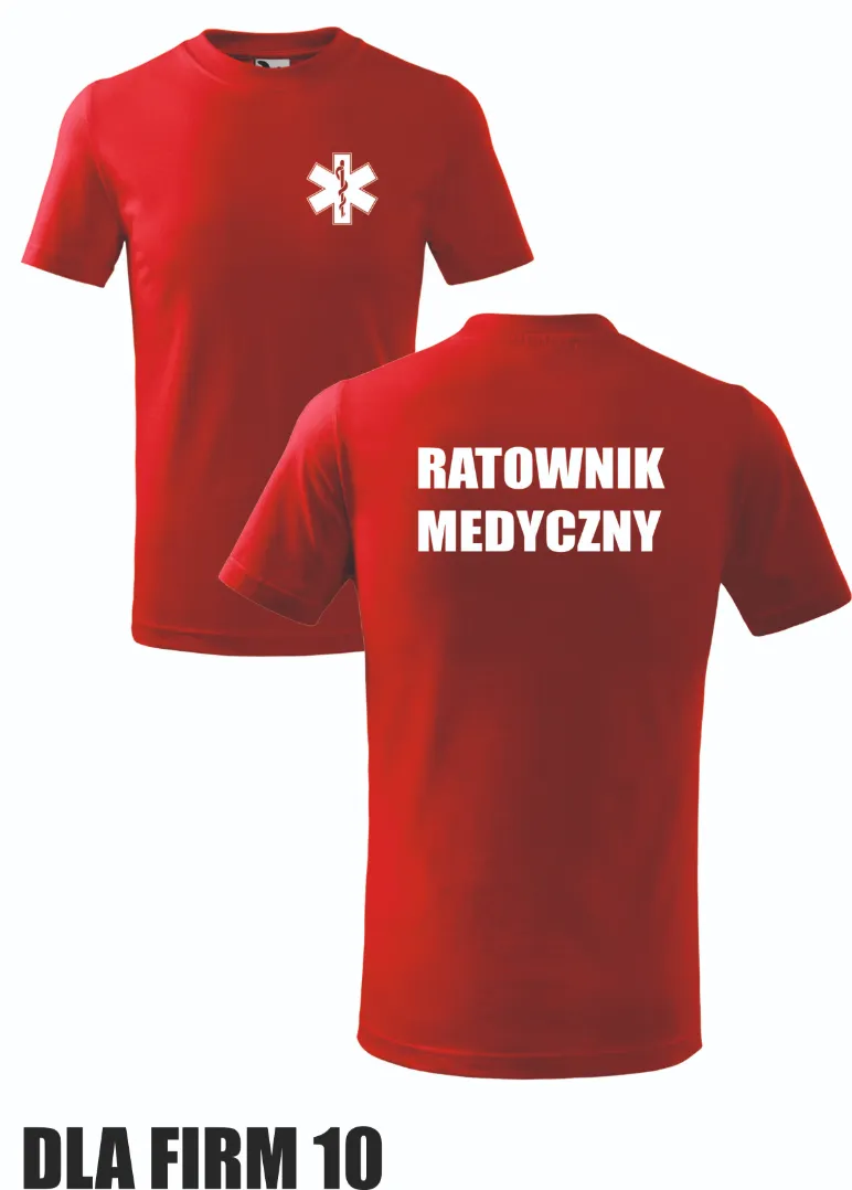 Koszulka „RATOWNIK MEDYCZNY”. Klasyczna koszulka z czerwonym tłem, symbolem ratownictwa medycznego z przodu oraz dużym napisem na plecach. Wyjątkowo widoczna i zaprojektowana z myślą o służbach medycznych.