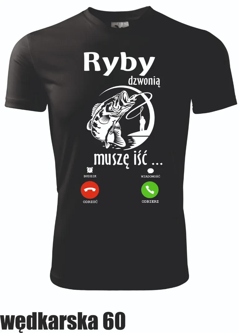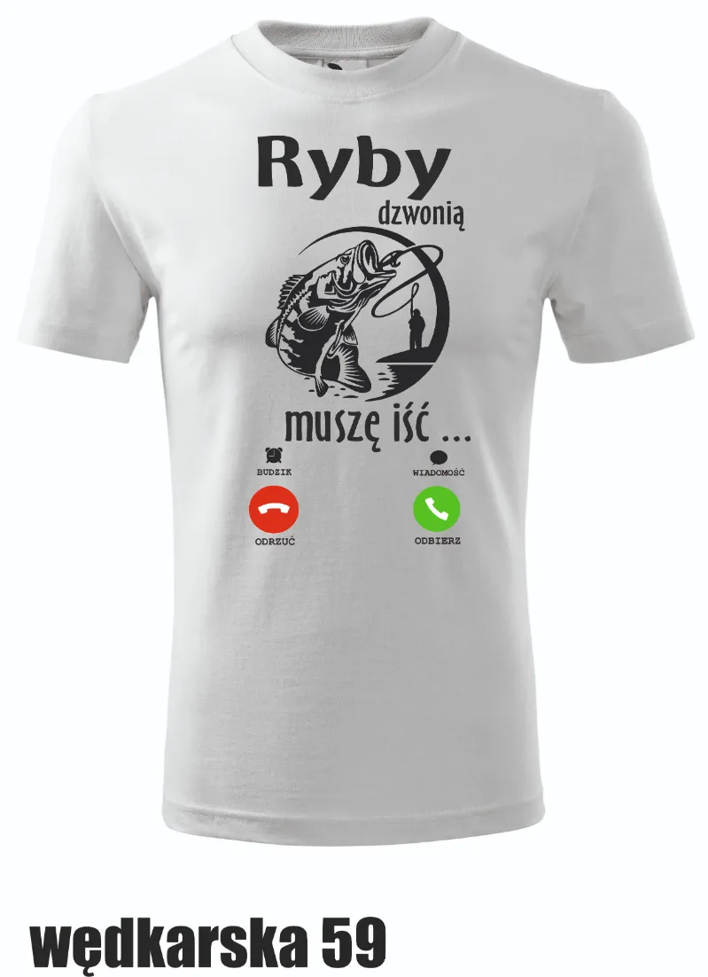 Koszulka z napisem „Ryby dzwonią, muszę iść…” oraz grafiką telefonu z opcjami odbioru lub odrzucenia. Idealny humorystyczny prezent dla każdego wędkarza, który nie potrafi odmówić sobie wyjścia na ryby.