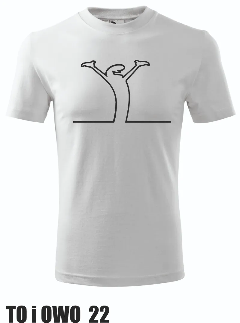 Koszulka z minimalistyczną grafiką przedstawiającą postać z uniesionymi rękoma. Stylizowany rysunek jest prosty, ale sugestywny, nadając koszulce nieco abstrakcyjnego charakteru.