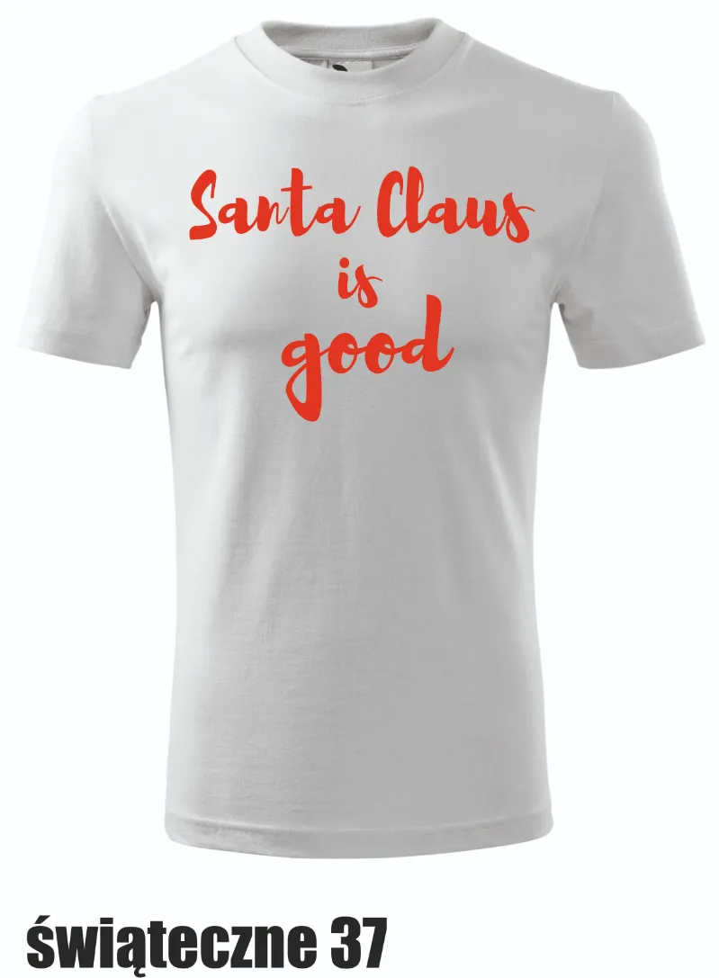 Minimalistyczny napis „Santa Claus is good” w czerwieni. Świetny wybór na spokojne, świąteczne stylizacje.