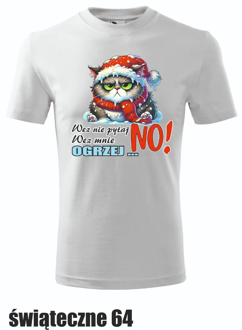 Koszulka z grafiką obrażonego kota w zimowym szaliku i napisem „Weź nie pytaj, weź mnie ogrzej… NO!”. Idealna na świąteczne dni z dużą dawką humoru.