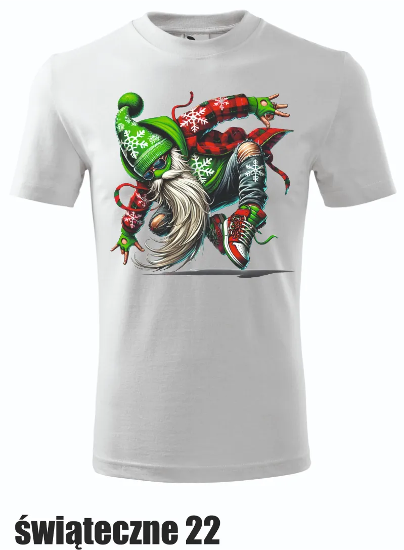 Oto Mikołaj w stylu hip-hopowym! W zielonej czapce z motywem śnieżynek i zielonymi okularami przeciwsłonecznymi, przygotowany jest do wykonywania akrobacji. Koszulka dla tych, którzy chcą połączyć świąteczny klimat z nutą młodzieżowego stylu.