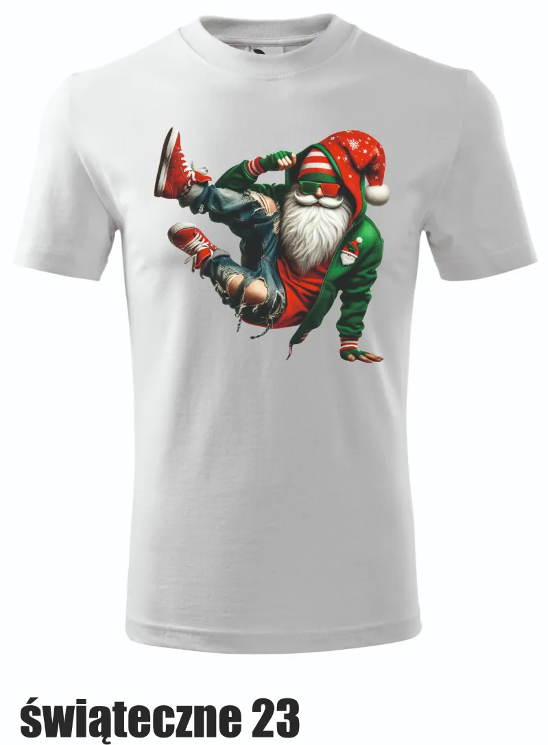 Święty Mikołaj w odważnej, tanecznej pozie w rozciągniętych jeansach! Ta koszulka łączy w sobie klasyczny świąteczny klimat z energią street dance’u, tworząc świetny wybór dla fanów nowoczesnych, świątecznych trendów.