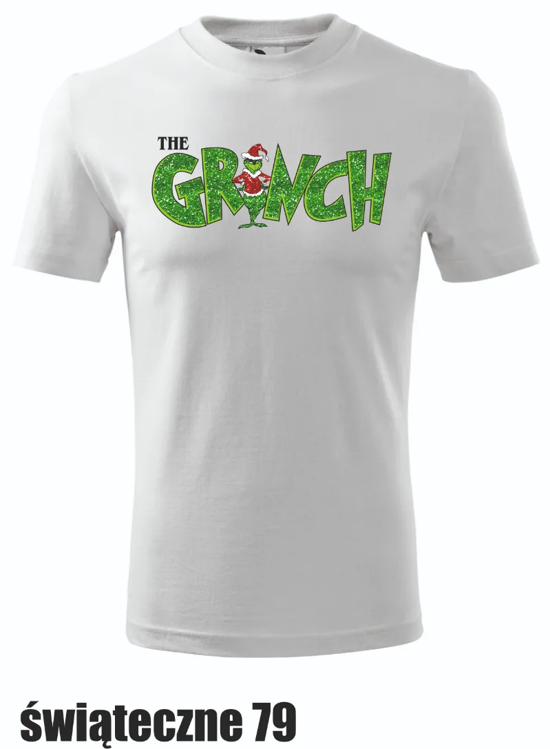 Minimalistyczny, ale wyrazisty wzór z napisem „The Grinch” w zielonym, brokatowym stylu. Koszulka dla fanów tej kultowej postaci, którzy lubią subtelne, ale charakterystyczne grafiki.