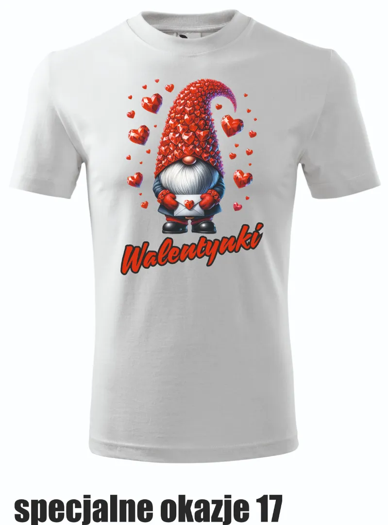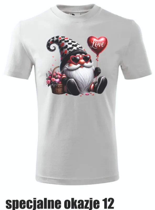Koszulka przedstawia skrzata z czapeczką pokrytą serduszkami oraz napisem „Walentynki”. Klasyczny, romantyczny design dla miłośników minimalistycznych wzorów.