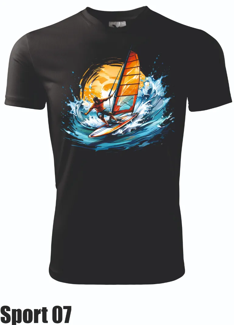 Dynamiczny nadruk windsurfera na falach, na tle zachodzącego słońca. Koszulka idealna dla osób, które kochają akcję i wiatr we włosach.